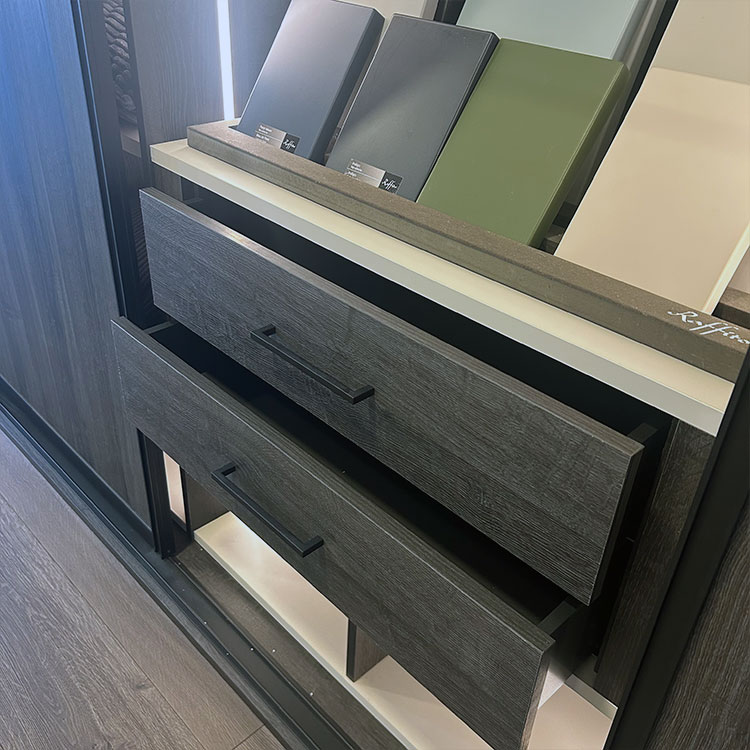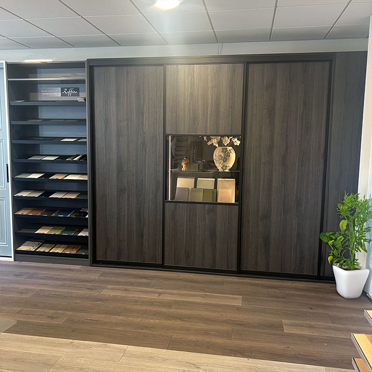 In onze showroom vind je onder andere een inloopkast inclusief alle mogelijke accessoires zoals verlichte garderobestang, softclose laden met glazen front en een apothekerskast van het merk StoreMax/Raffito. Een moderne vrijstaande kast in de kleur antraciet voorzien van stijldeuren, softclose systeem en een verrassend interieur. Witte glazen schuifdeuren van StoreMax afgewerkt met strips om de schuifdeur in eenvoudige vlakken te verdelen. Een hoekkast van Raffito, stijldeuren Milano en Dordogne, meervlaks deuren van Stanley en nog veel meer.